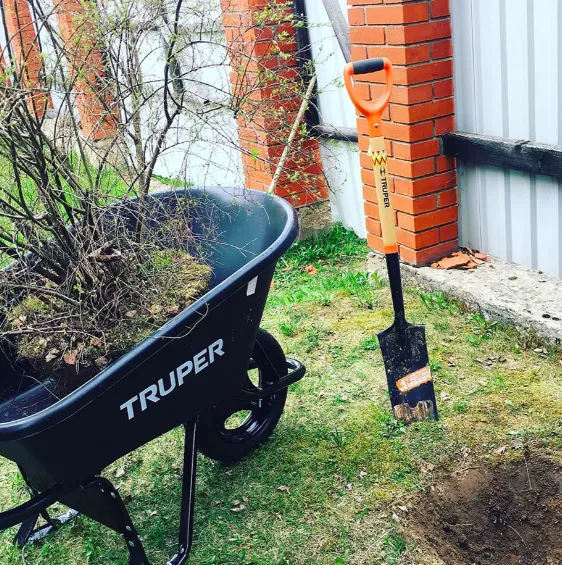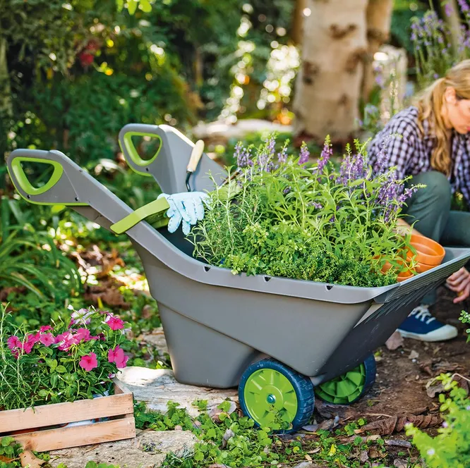 Основной плюс этой садовой тачки в том, что её можно загружать в двух положениях: стандартно сверху и установив горизонтально. Она легкая, прочная и маневренная, а использовать можно для самых разных целей: например, чтобы собрать лишний мусор весной с участка, это можно сделать, поставив тачку на борт и собрав граблями всё ненужное сразу в неё. Или довезти от машины до клумбы новые саженцы.