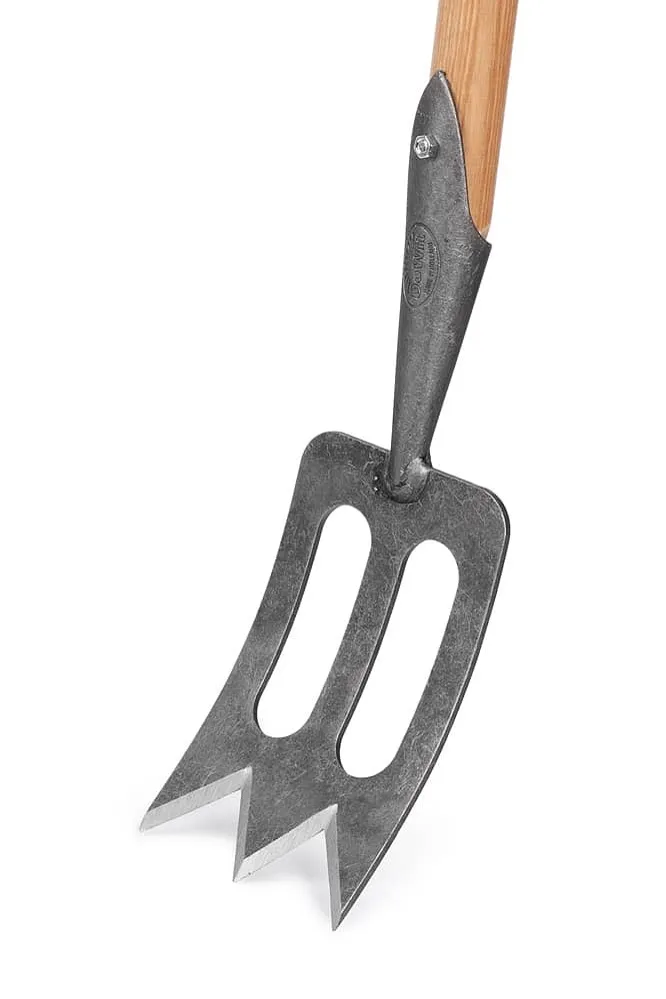 Это вилы или лопата? Технически – ни то, ни другое, но сочетает лучшие качества обоих. Зубцы из углеродистой стали плавно врезаются даже в самую тяжелую глинистую почву, но с меньшим трением благодаря открытым областям в лезвии. Работает как плоскорез, убирает сорняки, режет и снимает дерн, подходит для оформления и обрезки кромок у огородных грядок и клумб. В общем, позволяет быстрее и с наименьшими усилиями делать множество земляных работ. К тому же, служить будет годами, сделана очень основательно.