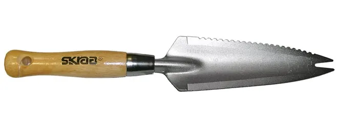 Этот инструмент кажется не очень-то нужным, но он на самом деле бесценен, так что можно носить каждый раз с собой в кармане или в поясной сумке садовода-огородника. С одной стороны лезвие имеет зазубрины для подрезания корней сорняков, с другой – ровное, заточенное лезвие, в центре нанесена шкала для определения глубины обработки почвы, а на конце расположена вилка для захвата и удаления корня. Благодаря зазубренному краю, он незаменим для прополки, его удобно использовать для посадки небольших многолетников и луковичных, разрезать боковой стороной и отделять плотные корни, если нужно рассадить растение и даже обрезать шпагат, которым подвязывали стебли.