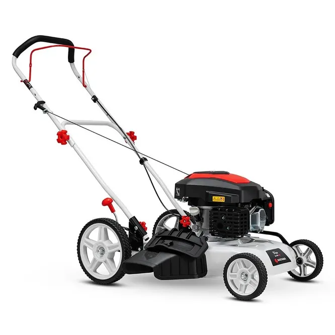 Газонокосилка с мощным бензиновым двигателем 4 л. с. подойдёт для средних участков и справится с любым типом травы, позволяя косить даже высокую траву без особых усилий. Косилка самоходная, достаточно лёгкая и манёвренная. Корпус газонокосилки изготовлен из стали, что обеспечивает долговечность конструкции. Задние колёса большего диаметра нужны для лучшей проходимости и манёвренности на неровных участках. Ручку можно регулировать по высоте, есть функция мульчирования и травосборник объёмом 55 литров.