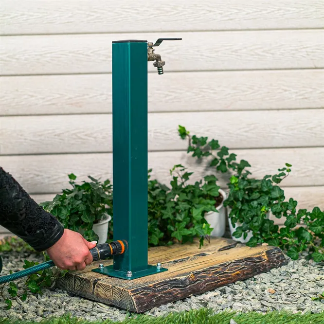 Колонка с поддоном под камень добавит яркий акцент ландшафту, будет удобна для полива, мытья рук, корнеплодов с грядок и садового инвентаря. Поддон долговечный, из прочного стеклопластика. Подключить колонку к водоснабжению можно при помощи гибкого шланга.
