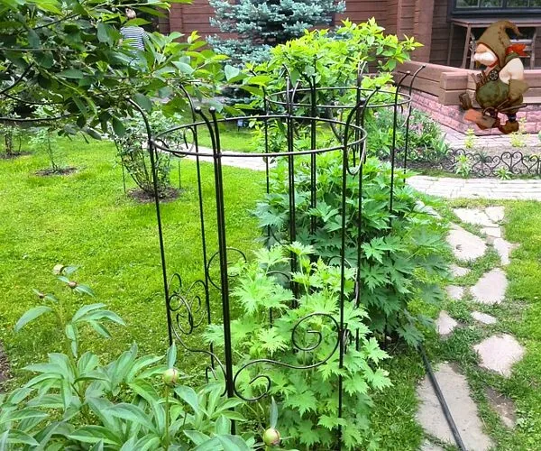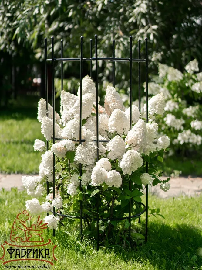Кованые опоры – красивые, прочные и долговечные, поэтому для самых любимых растений можно изготовить ковку на заказ, подобрав размер для большого куста и выбрав понравившийся дизайн. Служить будет очень долго, не сломается и защитит растения от ветра и непогоды. Гораздо лучше аналогов из пластика, которые ломаются в первый сезон, при этом стоят не намного дороже.