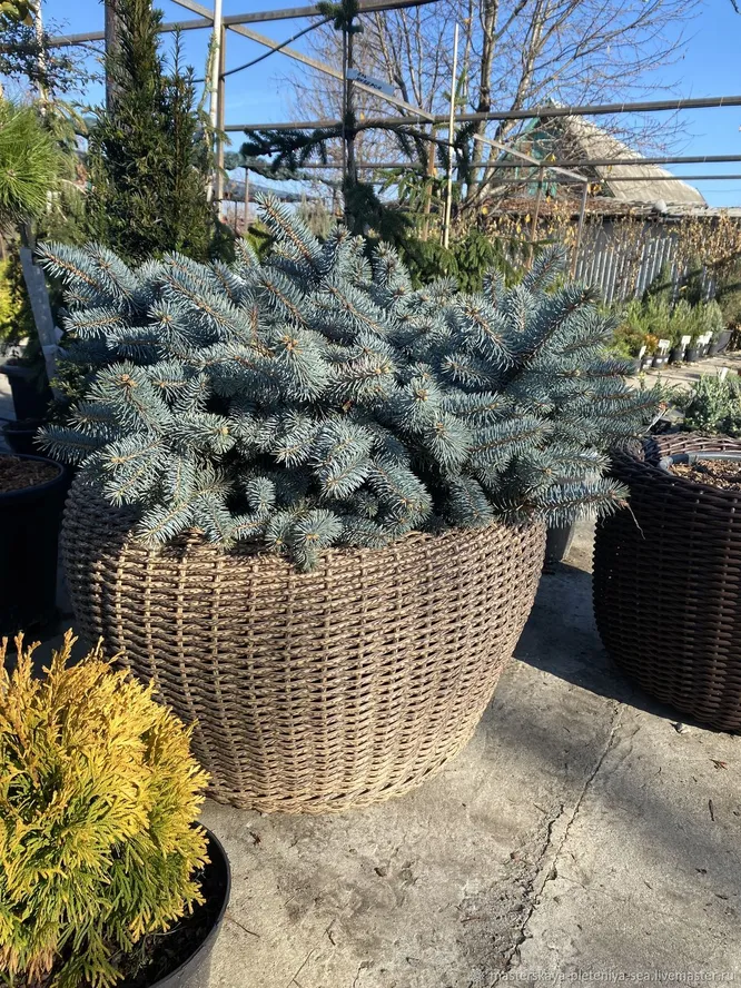 Большое, красивое кашпо на 45 литров из искусственного ротанга на пластикой форме украсит любой уголок сада и территорию вокруг дома. В дне есть отверстия для дренажа. Качество отличное, есть оттенки мяты, лаванды и соломы.