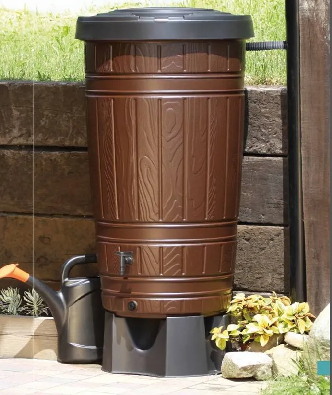 Водосборники – аккуратная и удобная замена некрасивым бочкам. Есть крышка, надежно предохраняющая содержимое бака от пыли и грязи, а также выемки со специальной резьбой, предназначенные для установки крана и садового шланга.