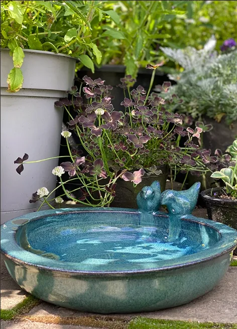 Круглая купальня из глазурованной керамики тёмно-бирюзового украсит сад и порадует птичек. Разместите её на высоту не менее метра от земли в полутени деревьев, чтобы было видно зеркало воды, и ждите пташек, прилетят обязательно попить и искупаться.