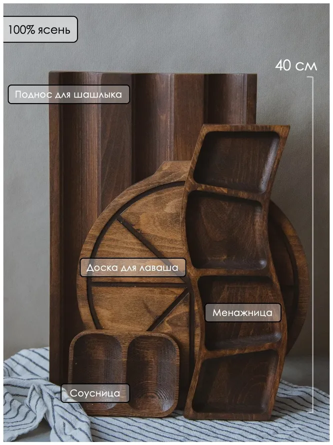 Ещё один вариант красивой сервировки – комплект из натурального дерева, обработанный натуральными маслом и воском. В комплекте доска для 6 шампуров, разделочная доска, соусница и менажница для закусок. Кстати, если друзья пригласили вас на дачный пикник в выходные, такой набор станет неплохим подарком.