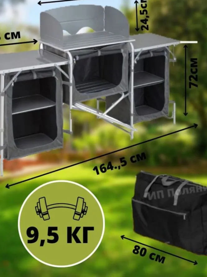 Заканчиваем нашу подборку целой переносной кухней, которую можно приспособить на даче или взять с собой в поход. В ней много отделений для хранения посуды и продуктов, которые можно закрывать на молнию. Собрать кухню можно за считанные минуты, а весит она всего 9,5 кг.