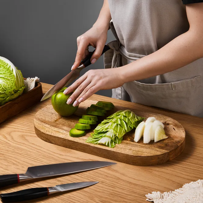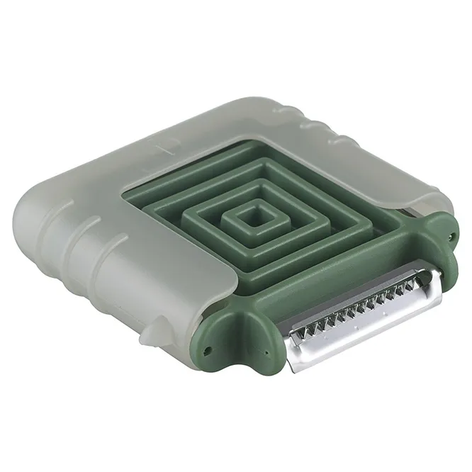 Небольшой и многофункциональный кухонный инструмент, с помощью которого можно почистить овощи или фрукты, нарезать их тонкой соломкой или украсить блюда. Гладким лезвием удобно чистить плотную кожуру, лезвие с мелкими зубчиками подойдет для помидоров или киви, а большие зубцы – для нарезки.
