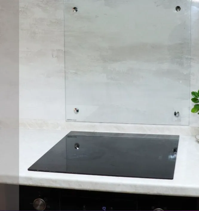 Удобная и простая в установке альтернатива кухонному фартуку из керамической плитки. Прозрачное закаленное стекло можно закрепить, например, к деревянной стене, чтобы защитить поверхность от перегрева, жирных капель или влаги во время приготовления еды или у кухонной мойки. Мыть защитный экран тоже легко при помощи любого чистящего средства. В продаже есть и прозрачное стекло, и черное.