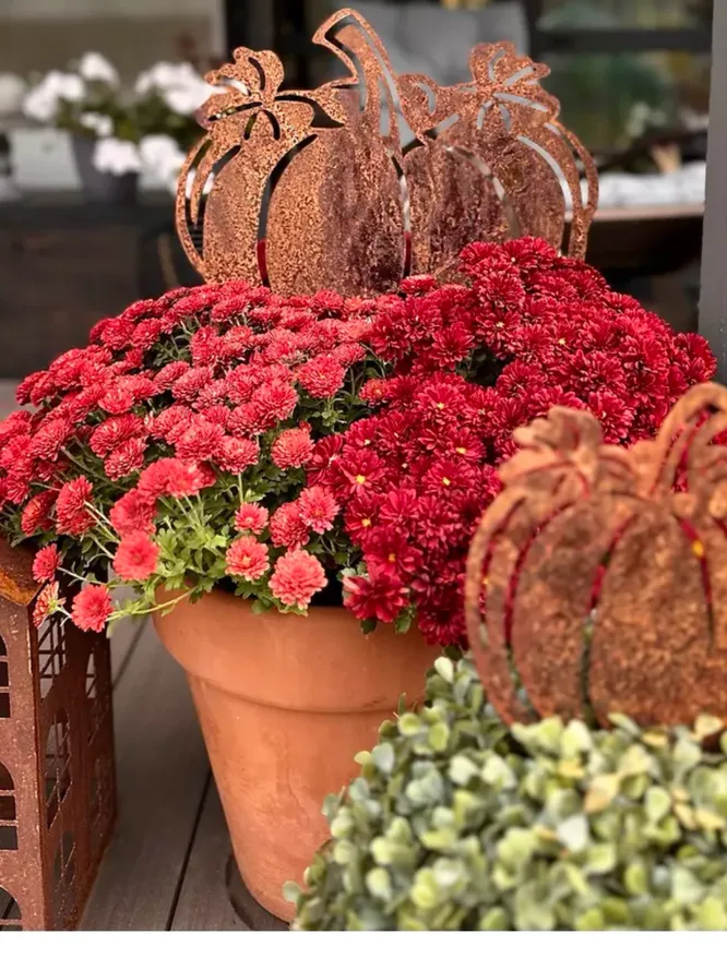 Если сад с приходом осени кажется немного опустевшим, не забывайте, что в любой момент можно добавить садовые фигуры и другие декоративные детали. Покупать осенью их тоже выгодно, так как весной они обычно стоят дороже. К примеру, эти очаровательные декоративные тыквы на фото. Сделаны из металла, достаточно прочные и легко выдержат осеннюю непогоду. Представьте, как здорово они будут смотреться в цветнике, на патио или в любом другом месте участка.