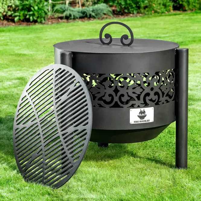 Выбирая костровую чашу, обращайте внимание не только на качество и толщину стали, но и на ширину ножек. Если они широкие, их можно поставить на газон, не делая специальную площадку. Металлические чаши продаются и с решеткой для гриля, но приобрести решетку можно отдельно.