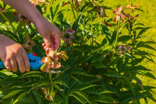 Летняя обрезка пионов должна начинаться с подготовки инструментов: секатор должен быть чистым, острым и продезинфицированным, лучше всего изопропиловым спиртом.