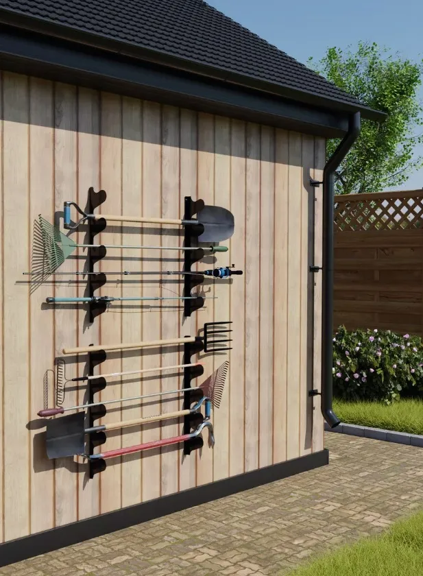 Крупные садовые инструменты вроде лопат или граблей тоже нужно где-то хранить. Для решения этой задачи хорошо подойдет специальный металлический держатель.