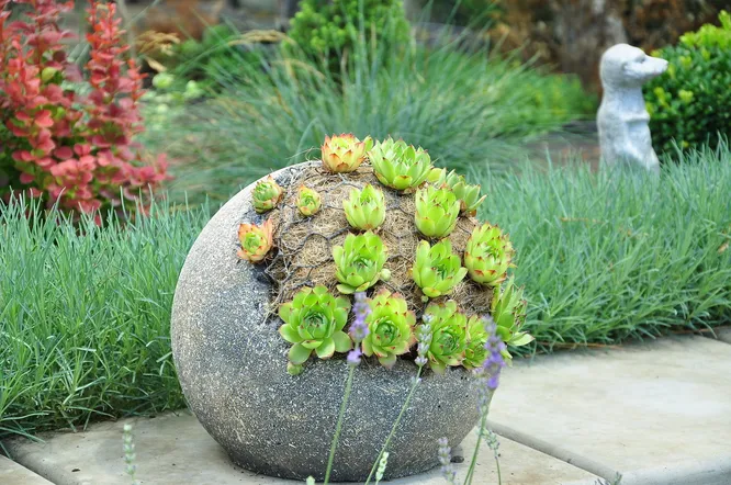 Шары разного размера можно собрать в композицию, разместив их в разных точках сада или создать композицию с почвопокровными растениями.