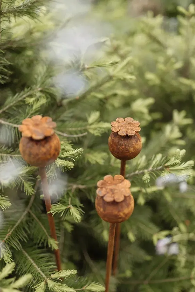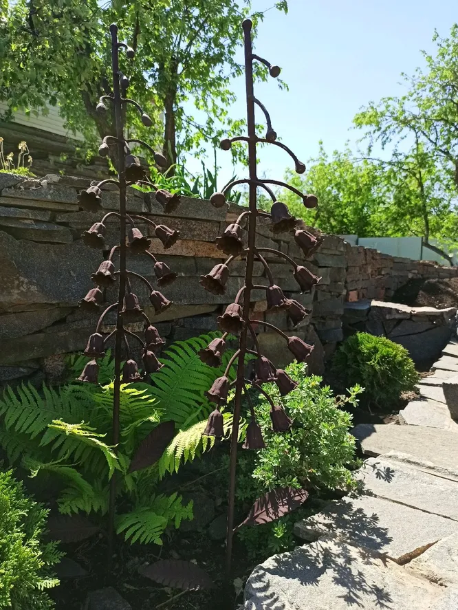 Элементы с «ржавым напылением» сейчас на пике популярности. Это могут быть «парящие» скульптуры на опорах, которые хорошо размещать в середине композиции/цветника или рядом с декоративными растениями. Садовые стики, шпильки и опоры очень красиво смотрятся в сочетании с карликовыми хвойниками, можжевельниками и другими многолетниками с декоративной листвой.
