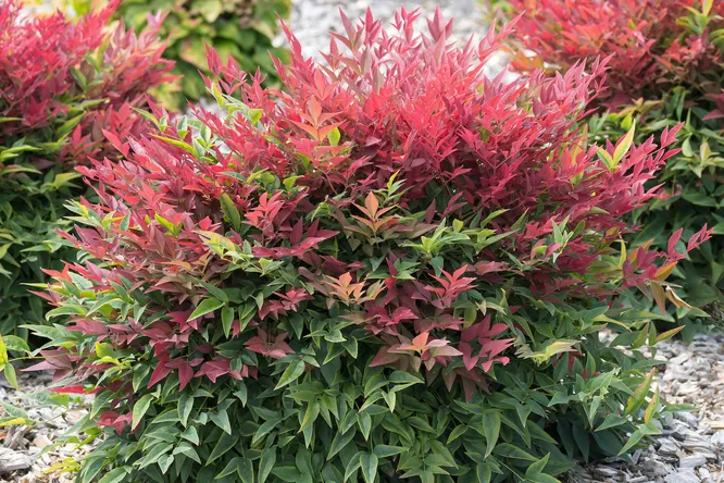 Осенью листва этого сорта нандины становится алой и отлично сочетается с ягодами такого же оттенка.
