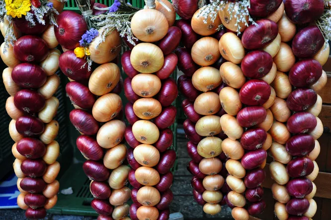 4. Когда «борода» (корешки) и листья лука полностью засохнут, некоторые заплетают его в косы и подвешивают. Делать это не обязательно, ведь лук можно обрезать.