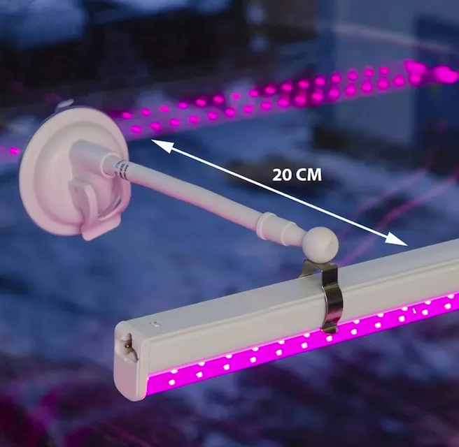 Удобная, легкая фитолампа для подоконника, в комплекте с которой продаются кронштейны с присосками для подвешивания. Подходит для рассады и комнатных цветов. Длина 87 см. Можно регулировать глубину и угол наклона осветительного прибора. Мощность светодиодных светильников 10 Вт. Работает в диапазоне, который обеспечивает эффективный фотосинтез, имеет особый спектр светового излучения с преобладанием красного и синего цветов. В комлпекте есть кабель длиной 2 метра. Фитолампы можно подключать последовательно друг к другу, до 15 устройств.