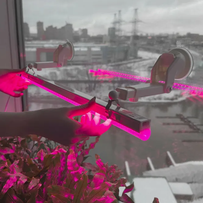- Если будете размещать фитолампу на подоконнике, можно крепить фитолампу на присосках к стеклу, при помощи кронштейна со струбциной или установить на штатив, который можно докупить отдельно.