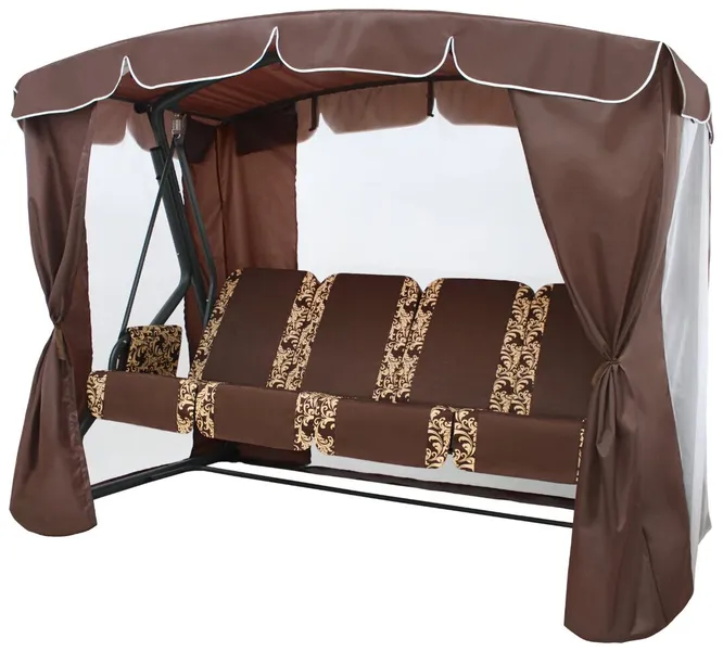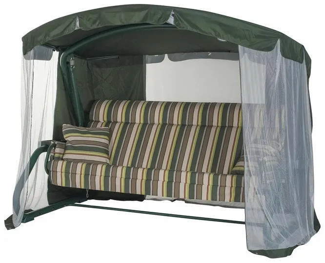 Как уверяет производитель — это идеальная находка для решения вопроса семейного отдыха на даче. Просторное сиденье длиной два метра и наполнением из поролона рассчитано на единовременное размещение четырех человек. Каркас из стальной трубы диаметром 63,5 мм способен выдерживать нагрузку до 450 кг. Основание сиденья — наварная сетка. Дугообразные опоры обеспечивают устойчивость и надежность всей конструкции. Приятным бонусом является противомоскитная сетка, которая защитит от назойливых насекомых даже вечером.