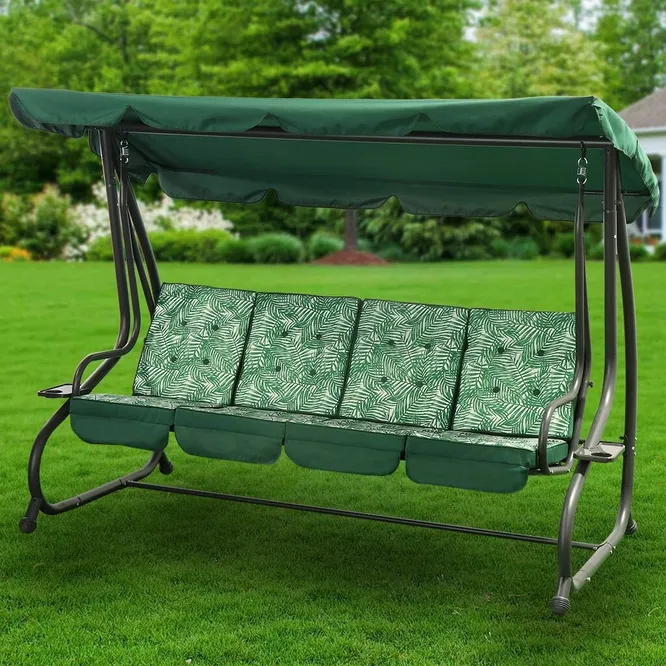 Четырехместные садовые качели имеют габариты 243х198х134 см и выдерживают нагрузку до 380 кг. При этом производитель использовал стальные трубки диаметром 51 мм, благодаря чему удалось снизить массу качели до 65 кг. Переставить ее в саду на новое место можно силами двух взрослых людей. Ширина каждого сиденья составляет 59.5 см, поэтому вчетвером сидеть достаточно просторно. В комплекте поставляются подлокотники и сетка для предотвращения проникновения насекомых. Тент бывает коричневого, красного или зеленого цвета. Чехол расстегивается спереди, поэтому в раскрытом положении получается прекрасный обзор. Фишкой этой садовой модели выступает сиденье с амортизацией. Благодаря этому присаживаться на качели гораздо комфортнее, а в процессе раскачивания вас будет колыхать не только вперед-назад, но и немного вверх-вниз.