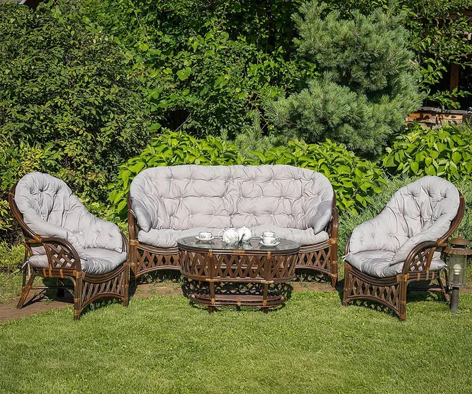 Много мебели делается из ротанга. Натуральный ротанг — это дорогой материал, бамбук, который обрабатывается особым способом. Такая мебель не боится солнца, влаги, перепадов температур. Она долговечна, если правильно обработана и покрыта лаком. При этом её, конечно, желательно накрывать — от дождя или пыли, особенно если на ней есть чехлы.