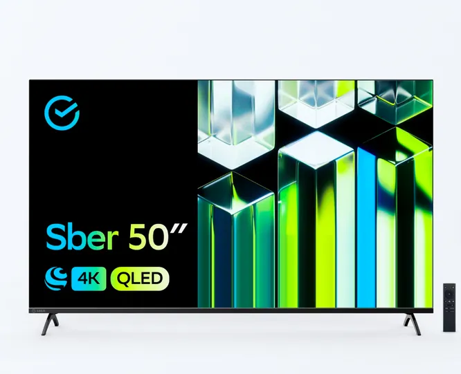 Умный телевизор Sber работает на базе операционной системы Салют ТВ. В отличие от обычных LED-телевизоров, у этой модели QLED-экран. То есть присутствует дополнительный слой нанокристаллов, которые излучают свет нужного цвета и выдают реалистичную картинку невероятной яркости. Также у телевизора очень качественный звук благодаря встроенным динамикам закрытого типа и современный безрамочный экран. Нужен только Интернет, и в распоряжении больше 100 каналов, различные онлайн-кинотеатры, где при помощи умного поиска можно найти любой фильм, сериал или мультик. А ещё есть голосовой помощник. Стоит только попросить, и ассистент Салют найдёт фильм, переключит канал и даже выключит свет. Да, с телевизора Sber можно управлять и умным домом.