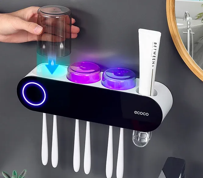 Симпатичное и удобное приспособление для всей семьи, которое поможет сэкономить место, позволит бережно расходовать пасту и содержать щётки в идеальной чистоте. Лампа с УФ-излучением дезинфицирует щетки регулярно в автоматическом режиме, уничтожая бактерии, микробы и грибки. Количество зубной пасты регулируется степенью нажатия, а чтобы не путаться, цвет своего стаканчика можно выбирать. Органайзер подходит и для простых, и для электрических щеток.