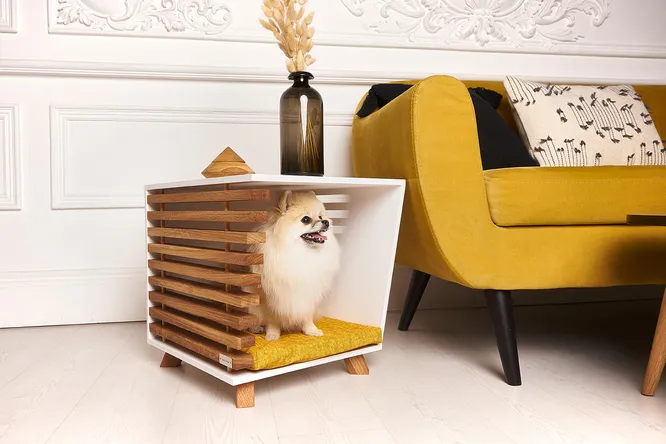 Удобный предмет 2 в 1: тумба, которую можно поставить у дивана или кровати и одновременно домик для питомца в футуристическом стиле. Сделан из интерьерной фанеры и массива кавказского дуба. Можно использовать для двух питомцев сразу: снизу собака, а сверху на уютном матрасе будет отдыхать кошечка.