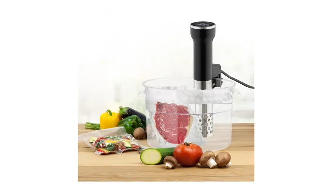 Су-вид, это очень модный сейчас метод приготовления блюд, суть которого достаточно проста. Продукт помещается в пакет, из которого полностью удаляется воздух, после чего опускается в воду с погружным термостатом. Прибор поддерживает постоянную низкую температуру (обычно в районе 52-70 градусов), благодаря чему вкус продукта раскрывается совсем по-другому. Крепится прибор на посуду с помощью прищепки и управляется за счет светодиодной панели, достаточно выбрать подходящие параметры и нажать на кнопку запуска.