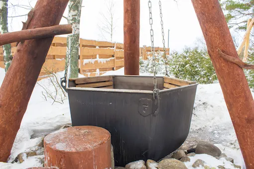 Затем парение вениками в бане «по-серому», пилинг, массажи, обертывания и чаепитие с отваром из трав, приготовленным на живом огне. И, конечно, главная «достопримечательность» бани — чан «Конек-горбунок» на открытом воздухе с нагретым на живом огне отваром из трав.