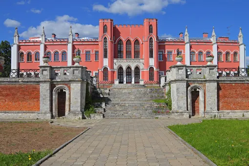 Главное усадебное здание розового цвета с россыпью остроконечных башен расположено правее. Последней хозяйкой имения, сделавшей его таким, стала Софья Панина. «Замкообразное» здание прекрасно, готично и «залюблено» киношниками. Чего здесь только не снимали – и «Дворянское гнездо», и «Свой среди чужих». Гулять можно долго. Интересных объектов масса. Беседки с античными статуями и классической музыкой. Три пруда, самый большой прямо у подножия длинной лестницы, ведущей от усадьбы, с грифонами у воды. Насыпные острова, куча лавочек.