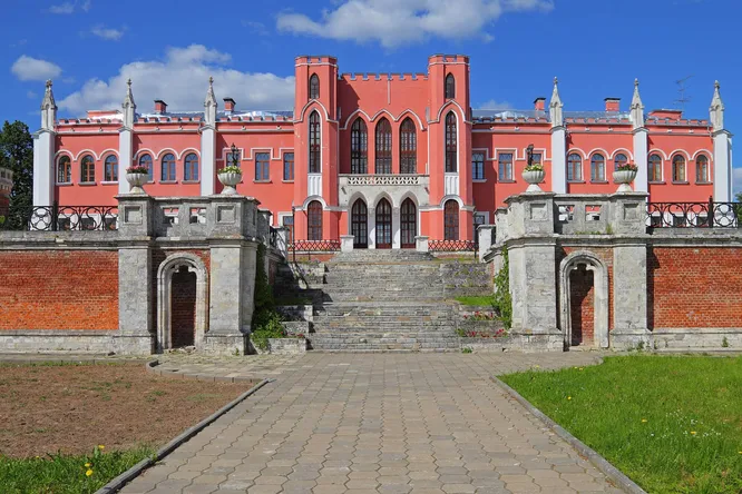 Главное усадебное здание розового цвета с россыпью остроконечных башен расположено правее. Последней хозяйкой имения, сделавшей его таким, стала Софья Панина. «Замкообразное» здание прекрасно, готично и «залюблено» киношниками. Чего здесь только не снимали – и «Дворянское гнездо», и «Свой среди чужих». Гулять можно долго. Интересных объектов масса. Беседки с античными статуями и классической музыкой. Три пруда, самый большой прямо у подножия длинной лестницы, ведущей от усадьбы, с грифонами у воды. Насыпные острова, куча лавочек.