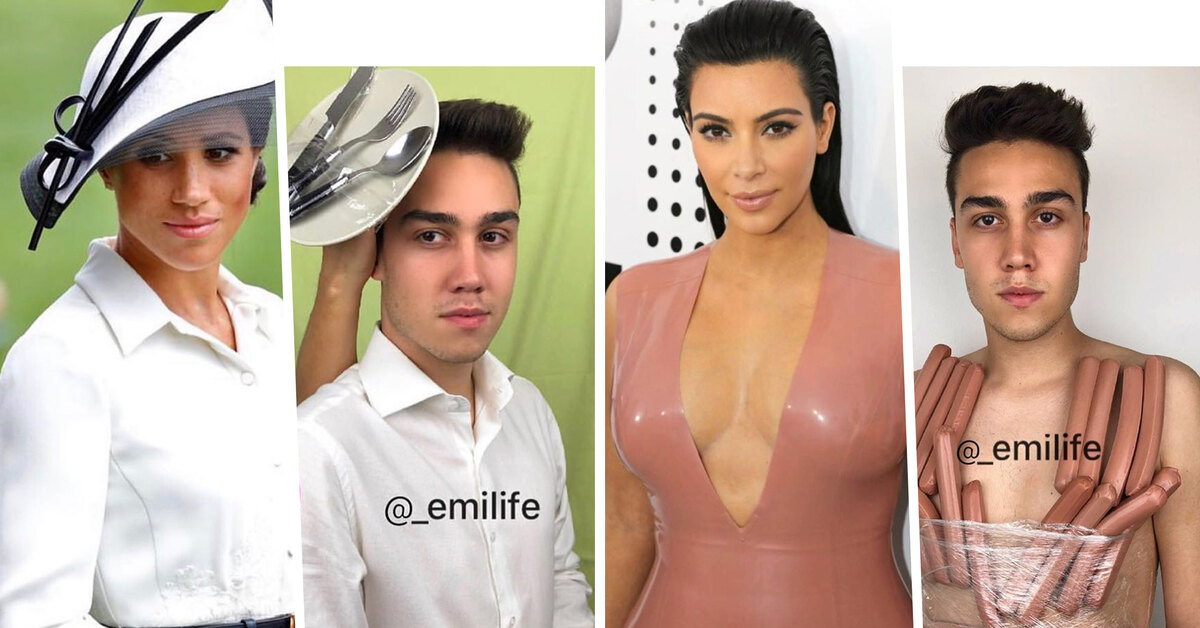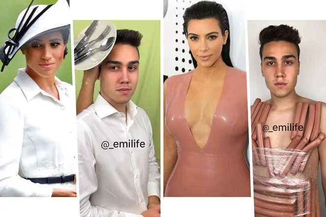 Ой, кажется, на еду все-таки тянет не Ким, а нашего блогера-пародиста. А ведь сколько хот-догов можно было сделать из этого «платья». Хотя, может, после этого фото он устроил сосисочную вечеринку? Очень надеемся, что ни один реквизит не пострадал при съёмке.