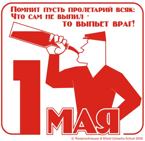 Очень популярны и первомайские открытки в советском стиле. Можно взять один из многочисленных пропагандистских плакатов и придумать к нему новую надпись, а можно нарисовать собственный «плакатик», вдохновившись этими образцами. Например, изобразить контуром узнаваемого рабочего, который пьет что-то из бутылки, и подписать: «Помнит пусть пролетарий всяк: что сам не выпил — то выпьет враг!».