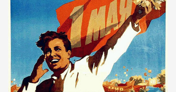 Очень популярны и первомайские открытки в советском стиле. Можно взять один из многочисленных пропагандистских плакатов и придумать к нему новую надпись, а можно нарисовать собственный «плакатик», вдохновившись этими образцами. Например, изобразить контуром узнаваемого рабочего, который пьет что-то из бутылки, и подписать: «Помнит пусть пролетарий всяк: что сам не выпил — то выпьет враг!».