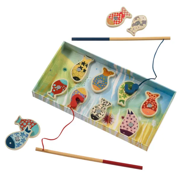Красивая игра развивает мелкую моторику, внимание, ловкость и воображение. 12 деревянных рыбок можно ловить на магнитные удочки и кидать обратно в синее море.