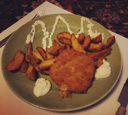 «Попытка изящным зигзагом майонезом по тарелке отвлечь внимание от пережаренной еды». Описание самого автора блюда.