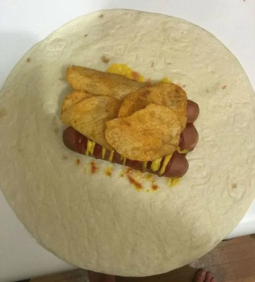 Фантазия на тему мексиканской тортильи с мясом и овощами: сосиски, чипсы и горцица на лепешке.