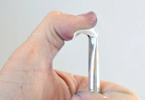 Обмакните кисточку в белую краску и пальцем проведите по щетинкам, чтобы полетели брызги-звездочки.