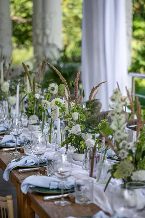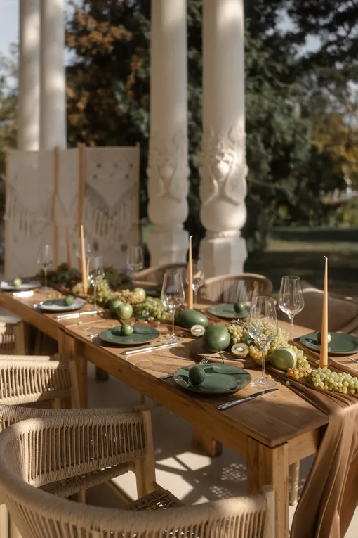 Бохо-шик отличает приглушенная палитра оттенков: молочно-белый, бежевый, пудровый, шалфей. Мебель для свадебной вечеринки в стиле бохо обычно деревянная, с плетеными элементами и росписью. На столах — вязаные скатерти, а лучше — акцентные винтажные льняные дорожки с вязаным кружевом. Для настоящей бохо-свадьбы необходим дресс-код: вечерние платья и строгие жаркие костюмы уступают удобной светлой одежде из натуральных тканей и хендмейд украшениям. В декоре не только свежие цветы, но и пампасная трава, фотозоной может служить гамак и ширмы макраме.