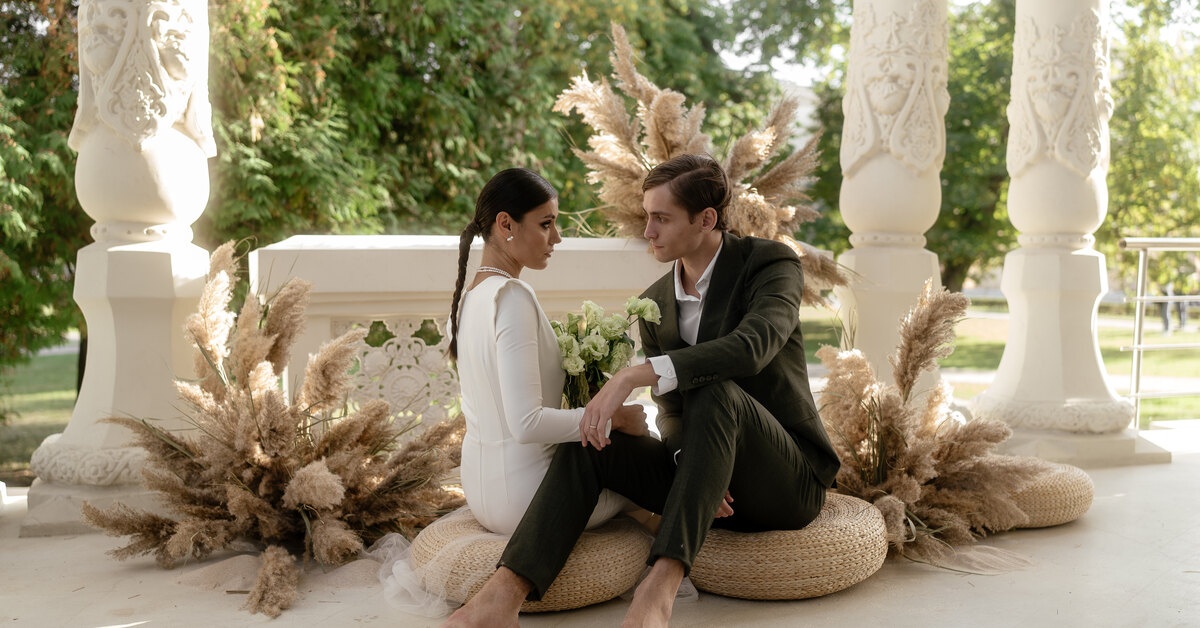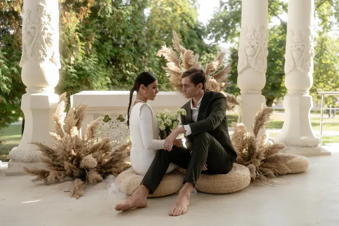 Бохо-шик отличает приглушенная палитра оттенков: молочно-белый, бежевый, пудровый, шалфей. Мебель для свадебной вечеринки в стиле бохо обычно деревянная, с плетеными элементами и росписью. На столах — вязаные скатерти, а лучше — акцентные винтажные льняные дорожки с вязаным кружевом. Для настоящей бохо-свадьбы необходим дресс-код: вечерние платья и строгие жаркие костюмы уступают удобной светлой одежде из натуральных тканей и хендмейд украшениям. В декоре не только свежие цветы, но и пампасная трава, фотозоной может служить гамак и ширмы макраме.
