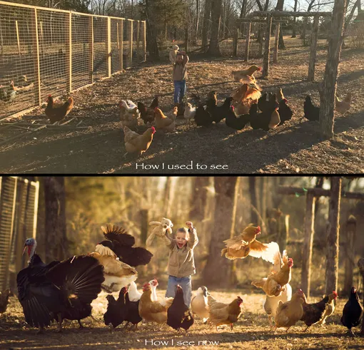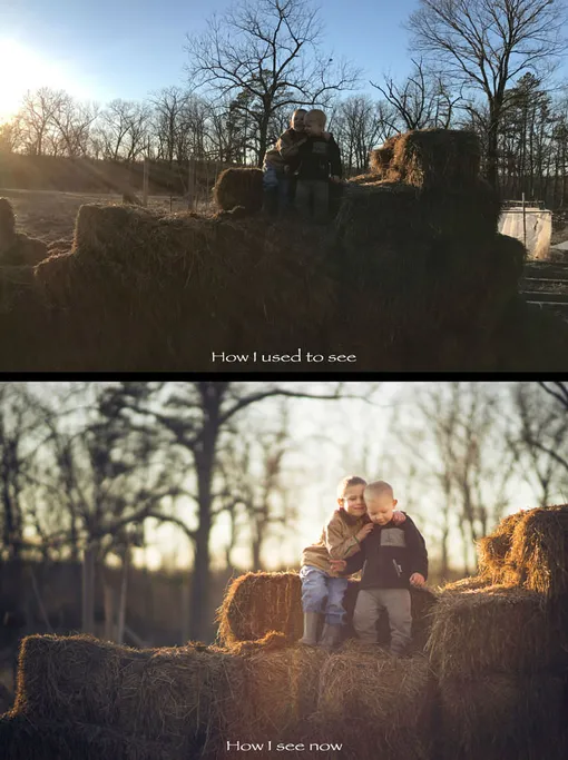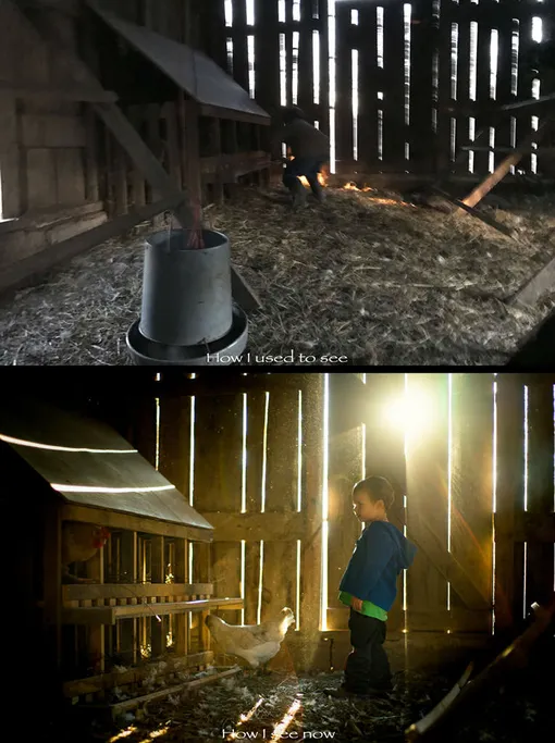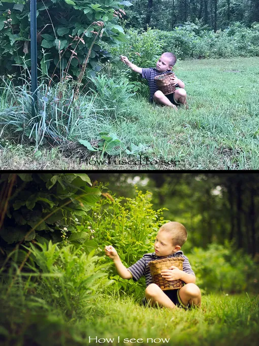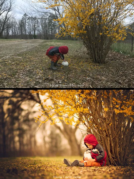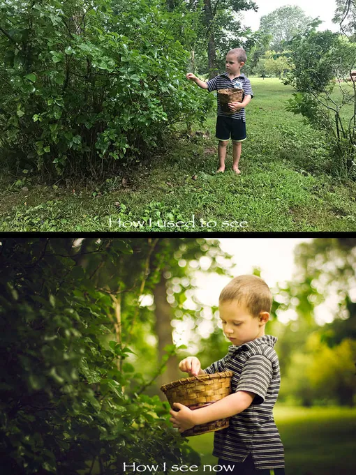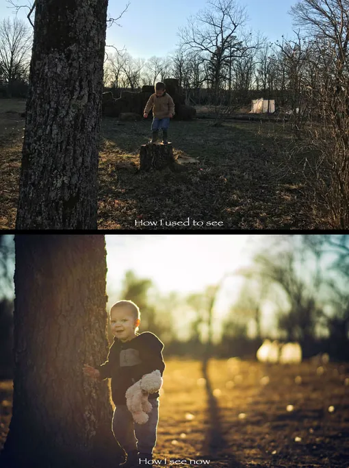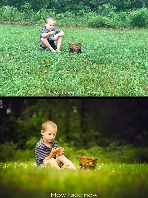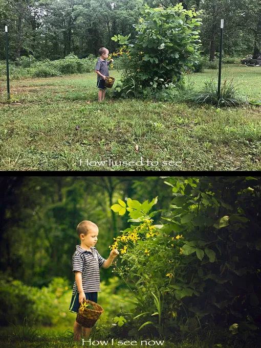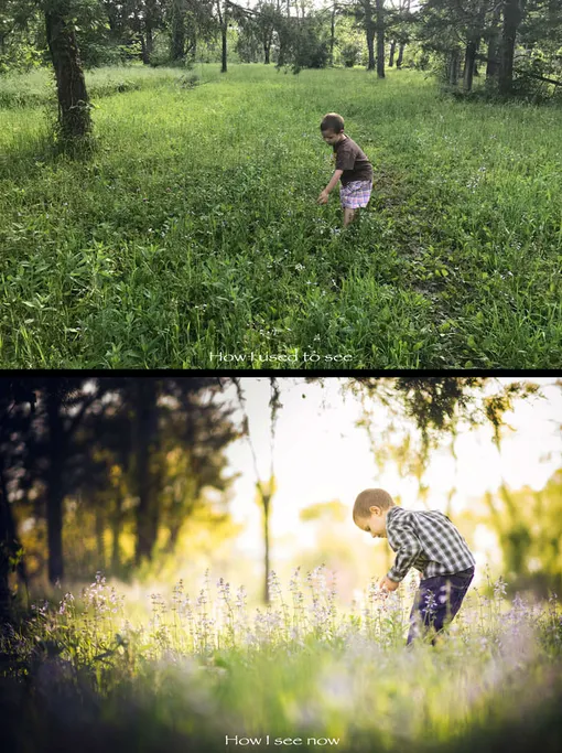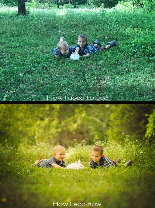 Подпись к фото сверху: «как я видел раньше», снизу «как я вижу теперь». «Два года назад я жил обычной жизнью, не замечая красоты вокруг себя. После того, как я взял камеру и начал фотографировать своих детей, я увидел мир совершенно по-новому. Когда вы начинаете видеть, вы больше не сможете не замечать, насколько мир прекрасен».