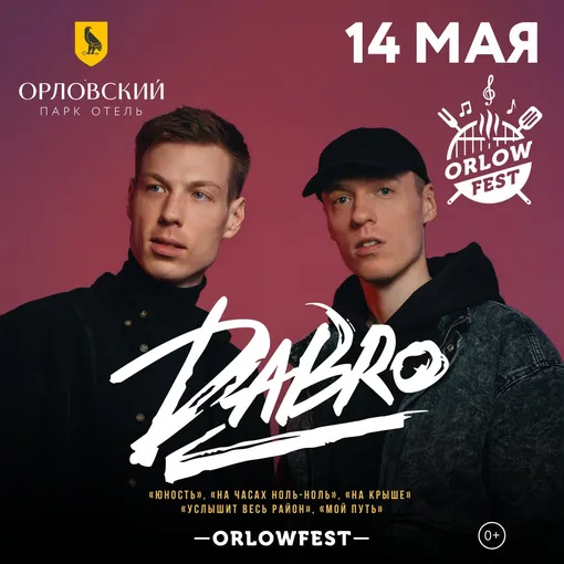 Хедлайнером Orlow Fest 2022 станет группа Dabro («Дабро») – знаменитый дуэт из Казани, в состав которого входят братья Михаил и Иван Засидкевичи. Популярность обрушилась на Dabro в 2020-м после релиза трека «Юность». Эти простые и понятные всем эмоции очень подходят под тематику майского события — юность, первая любовь, свежие чувства, романтика!