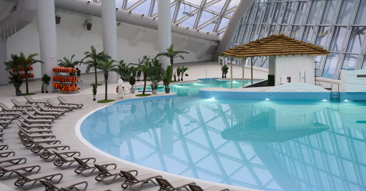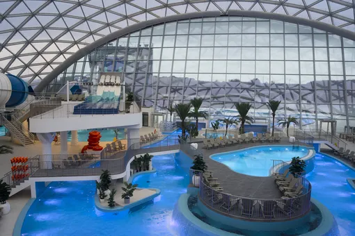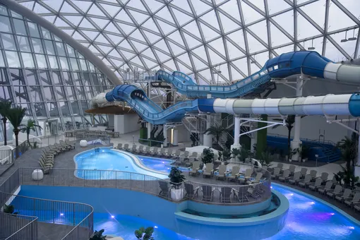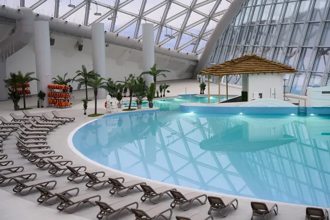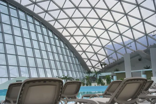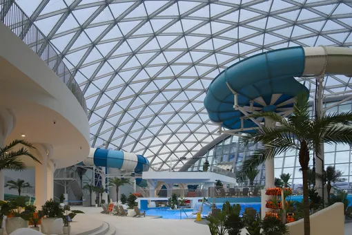 Специальная конструкция кровли аквапарка создаёт эффект открытого неба. Два купола покрыты специальной пленкой, пропускающей естественный солнечный свет и ультрафиолет, что позволяет загорать даже зимой. Солнцезащитное средство пригодится!