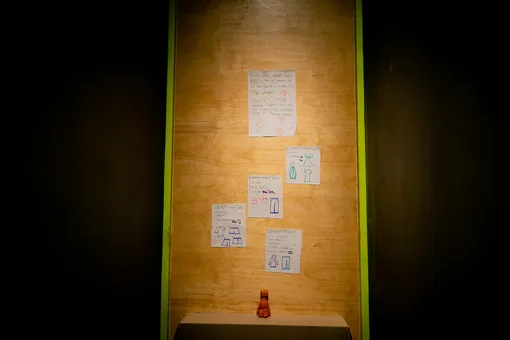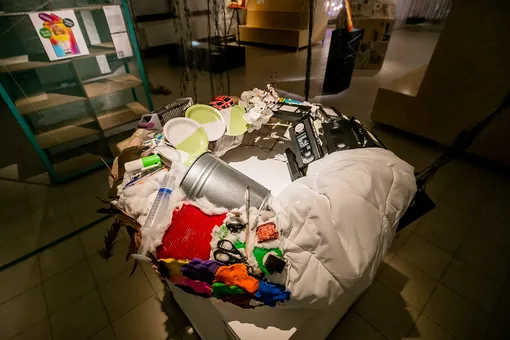 Работа Софии Муковоз из «Мастерской художественного текста» — попытка переосмыслить теорию пяти стадий принятия, разработанную Элизабет Кюблер-Росс. Психолог описывает путь, который проходит человек в процессе принятия горя так: отрицание, гнев, торг, депрессия и принятие. Все эти состояния София выразили через конкретные предметы —выбрала их она на основе опроса, попросив людей рассказать, какие вещи ассоциируются с каждой из этих стадий.