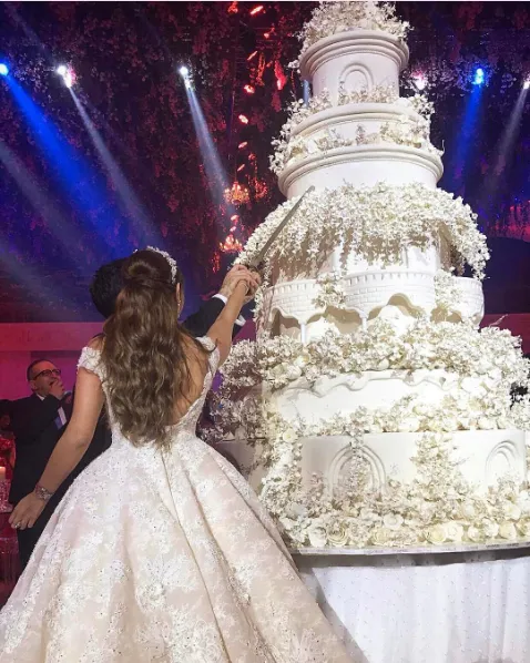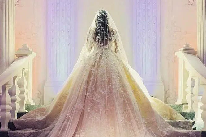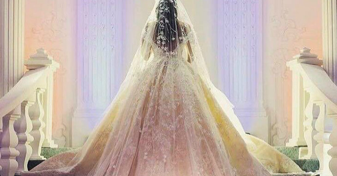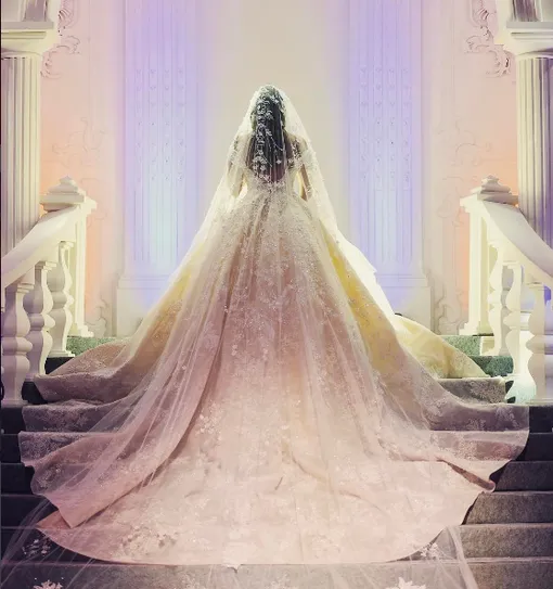 Свадебное платье невеста заказала ливанскому модельеру Зияду Накаду, известному своим вниманием к мелочам. Классическое «платье принцессы» было украшено вышитыми цветами, а его шлейф полностью закрывал лестничный пролет.