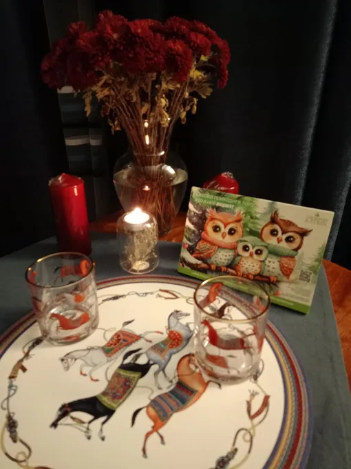Себе любимой уже купила к Новому году бокалы, свечи и керамическую лошадку — захотелось чего-то бордового, всплеска цвета, ну и год же Огненной Лошади! Бокалы необычные — лёгкие, при это ножка очень устойчивая.