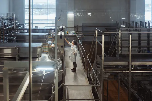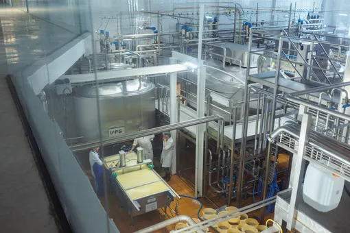 Выставочные залы переходят в большой коридор с панорамными стеклами, чтобы гости смогли посмотреть, как производится сыр на новом оборудовании и на старом.