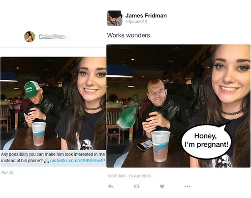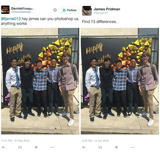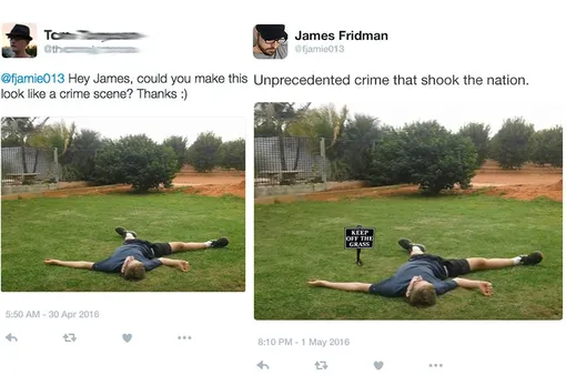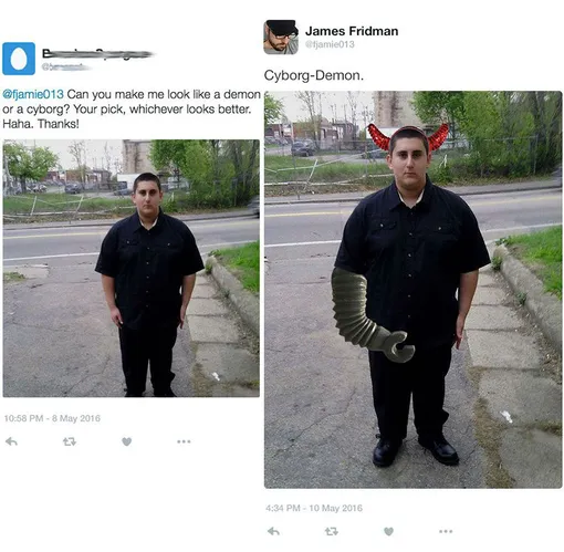 Поэтому за его творчеством следят почти полмиллиона подписчиков. А заказчики, присылающие фотографии, каждый раз гадают, как этот шутник истолкует их просьбу. Смотрите сами.